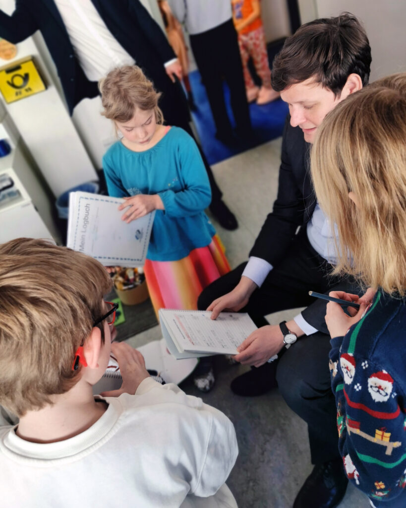 Die Schülerinnen und Schüler der Stammgruppe Uranus gaben spannende Einblicke: Sie zeigten, wie sie mit ihrem Logbuch ihren Lerntag planen und Fortschritte festhalten. Im Containerbau der Grundstufe konnte Conrad Clemens auch erleben, wie der gebundene Ganztag im Tandem von Erzieherinnen und Lehrkräften gestaltet wird.