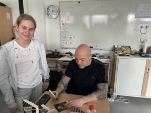 Nach dem Lesen durften wir Schüler und Schülerinnen unsere Fragen stellen. Eine davon lautete: ,,Gab es einen Aha-Moment oder noch Alternativen für den Titel?” Johannes Herwig erklärte, dass er lange nur einen provisorischen Arbeitstitel hatte, der aber überhaupt nicht gut klang und unbedingt geändert werden sollte. Seine Lektorin gab ihm dann den Tipp, dass die besten Titel oft direkt im Buch zu finden sind. Zufällig stieß er dann auf den Satz ,,Und als Hilma nach Hause ging und mit ihr das Koffergrammofon, sang der Rest in die Nacht, bis die Sterne zitterten.” und entschied sich schließlich für den Titel ,,Bis die Sterne zittern“.