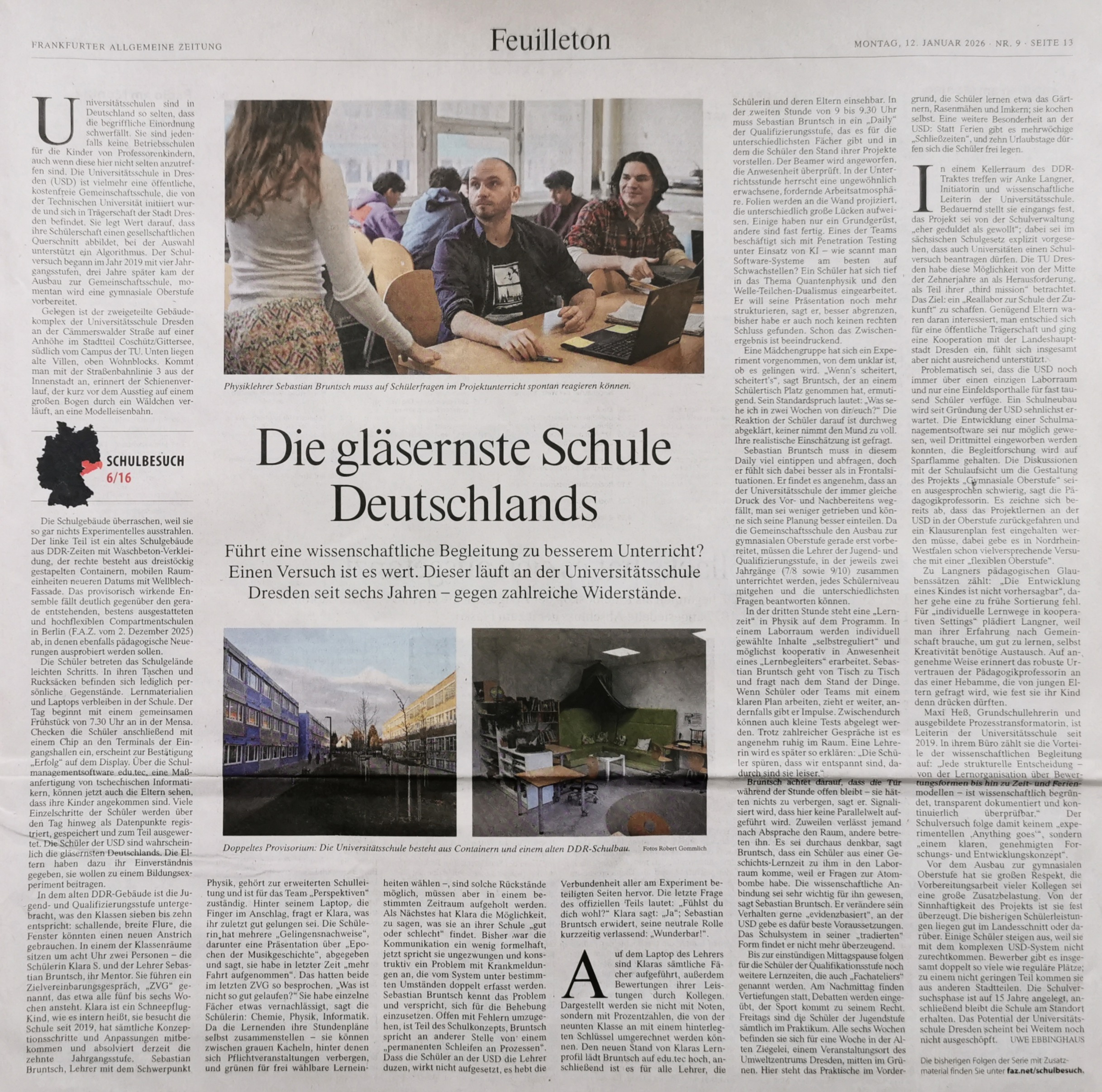 In der Reihe Schulbesuch erscheint monatlich das Portrait der interessantesten Schule in einem Bundesland. Im Januar 2026 ist das in Sachsen für die Redaktion der gemeinsame Schulversuch von TU Dresden und Stadt Dresden. Der Artikel stellt die Frage: